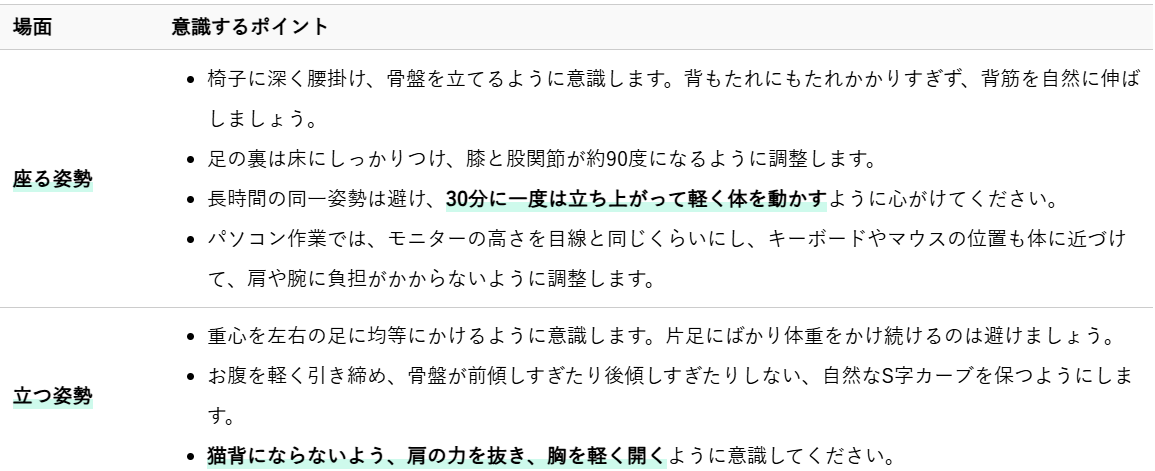 ウォーキングや水中運動など、体に負担の少ない有酸素運動を習慣にしましょう。全身の血行が促進され、筋肉の柔軟性が保たれ、体幹を支える筋肉の維持にも繋がります。無理なく続けられる範囲から始めてください。