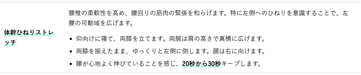 硬くなった筋肉をほぐし、柔軟性を高めることは、左側の腰の痛みを和らげる上で非常に重要です。特に、左側の腰に負担をかけやすい筋肉に焦点を当てたストレッチや体操を取り入れましょう。痛みを感じる場合は無理せず中止し、心地よい範囲で行ってください。