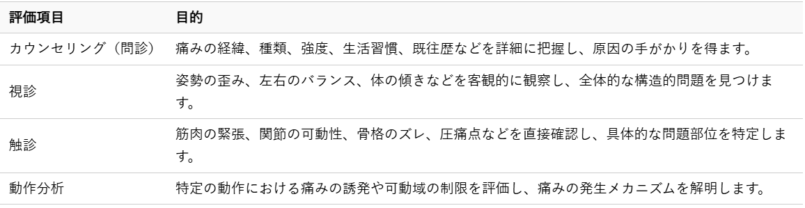 まず、お客様の痛みについて詳しくお伺いします。いつから痛みがあるのか、どのような時に痛むのか、痛みの種類や強さ、日常生活での影響など、詳細な情報を丁寧にヒアリングします。これは、痛みの背景にある生活習慣や体の使い方、既往歴などを把握するために不可欠なプロセスです。