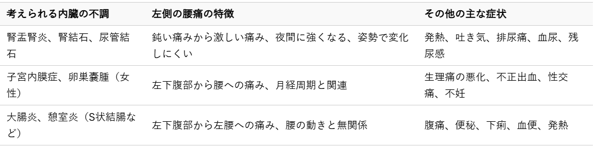 内臓からの関連痛は、姿勢を変えても痛みが緩和されにくい、安静にしていても痛む、といった特徴を持つことがあります。以下に、左側の腰痛に関連する内臓の不調とその特徴をまとめました。