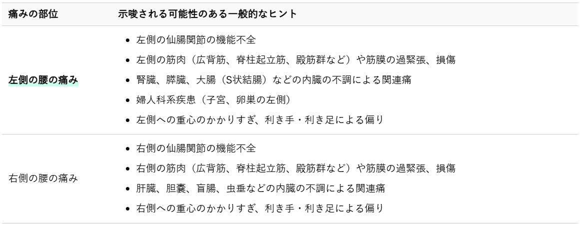 腰の痛みが左側に出るのか、右側に出るのかによって、その背景にある原因のヒントが異なることがあります。これは、体の構造や内臓の配置、さらには日常的な体の使い方の偏りが左右で異なるためです。