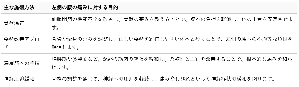 骨盤や背骨の関節の動きを改善し、周囲の筋肉の緊張を和らげることで、神経へのストレスが減少し、結果として痛みやしびれの緩和につながります。このアプローチは、左側の腰の痛みが神経症状を伴う場合に特に重要となります。