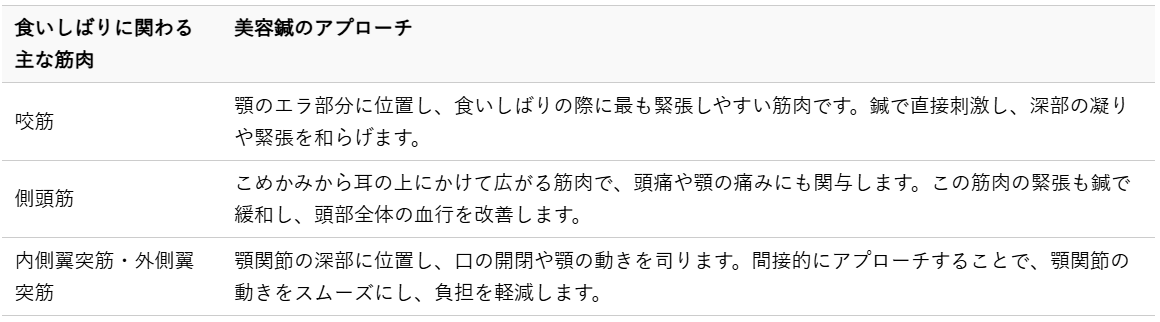 食いしばりの主な原因となるのは、咀嚼(そしゃく)に使われる筋肉の過度な緊張です。特に、顎のエラ部分にある咬筋や、こめかみ部分にある側頭筋は、ストレスや習慣によって硬くなりやすい筋肉です。美容鍼では、これらの筋肉に直接アプローチし、深部の緊張を緩めることを目指します。
