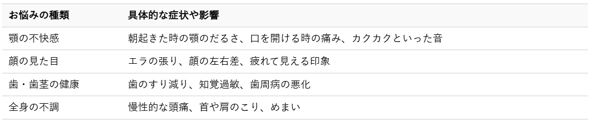 無意識のうちに歯を強く噛みしめる「食いしばり」は、単なる癖だと軽視されがちですが、実は全身に様々な不調を引き起こす原因となることがあります。以下のようなお悩みを抱えていませんか。