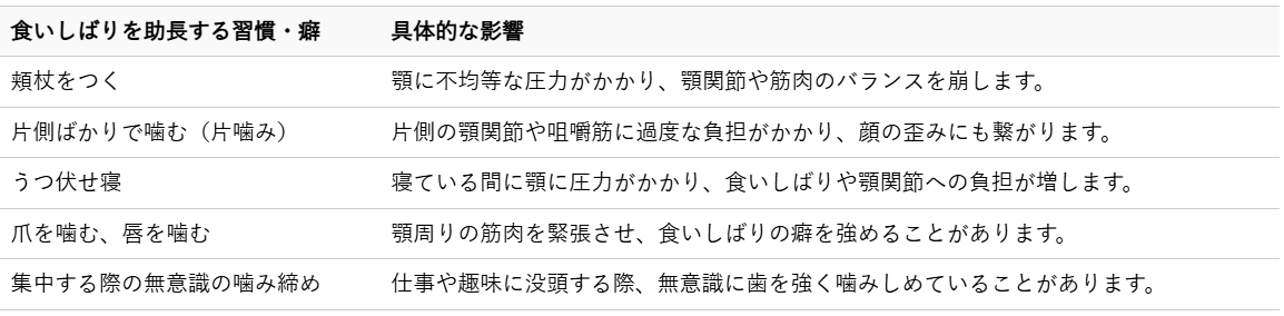 さらに、以下のような特定の癖も食いしばりを助長する原因となります。