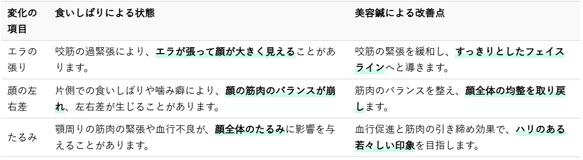 食いしばりは、顎周りの筋肉、特に咬筋を過度に発達させ、エラの張りや顔の歪みの原因となることがあります。美容鍼は、これらの筋肉の緊張を緩め、本来の筋肉の状態へと導くことで、見た目の変化をもたらします。
