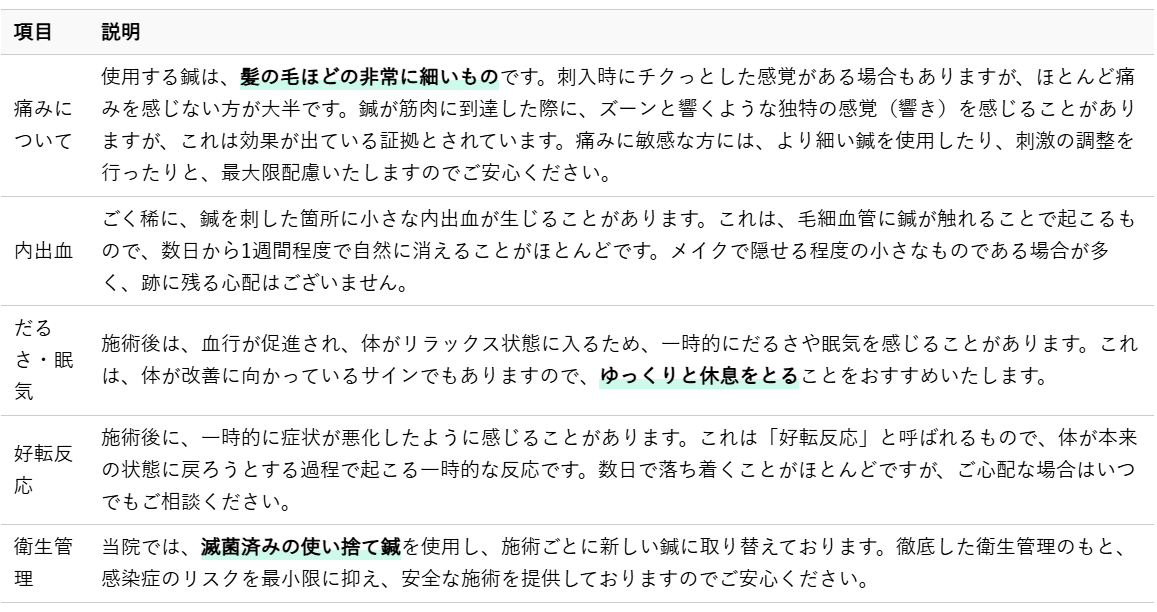 美容鍼の施術を受けるにあたり、痛みや副作用に関して不安を感じる方もいらっしゃるかもしれません。ここでは、安全性と起こりうる反応についてご説明いたします。