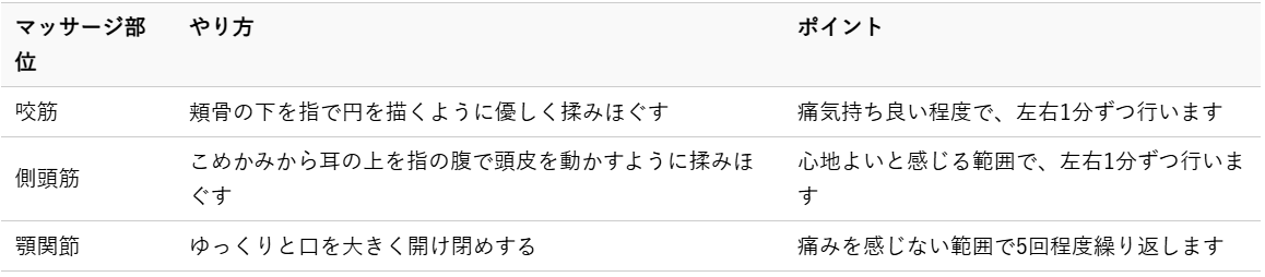 人差し指から薬指の3本を使い、頬骨の下あたり、奥歯を噛みしめたときに盛り上がる部分に当ててください。円を描くように、ゆっくりと優しく揉みほぐします。痛気持ち良いと感じる程度の力加減が目安です。このマッサージを左右それぞれ1分程度行いましょう。血行が促進され、筋肉の緊張が和らぐのを感じられるはずです。