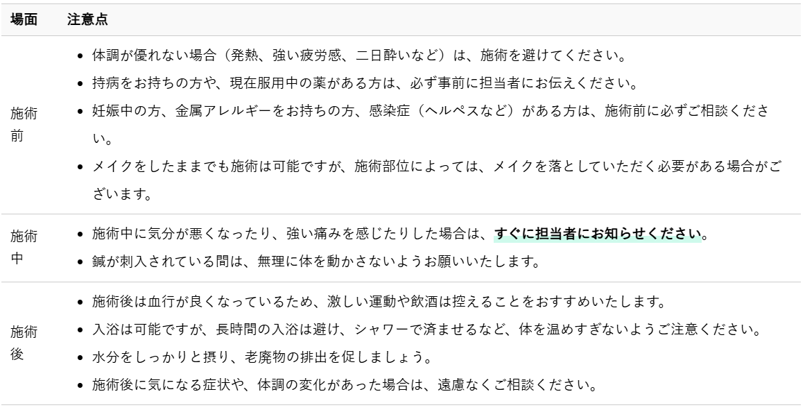 美容鍼の施術を安全に、そして効果的に受けていただくために、いくつか注意していただきたい点がございます。
