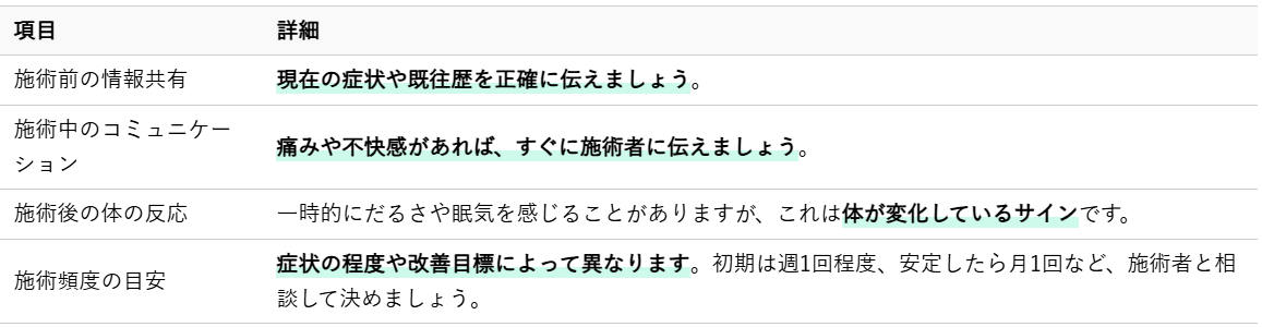施術中には、痛みや不快感があれば、我慢せずにすぐに伝えるようにしてください。無理な施術は逆効果になる可能性があります。また、施術後は一時的にだるさや眠気を感じることがありますが、これは体が変化している過程で起こる自然な反応であることが多いです。