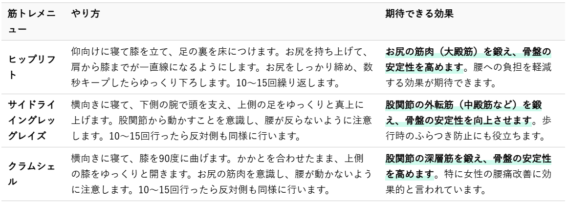 - お尻と股関節周りの筋力向上: 殿筋群や股関節を支える筋肉を鍛えることで、骨盤の安定性を向上させ、腰への負担を軽減します。
