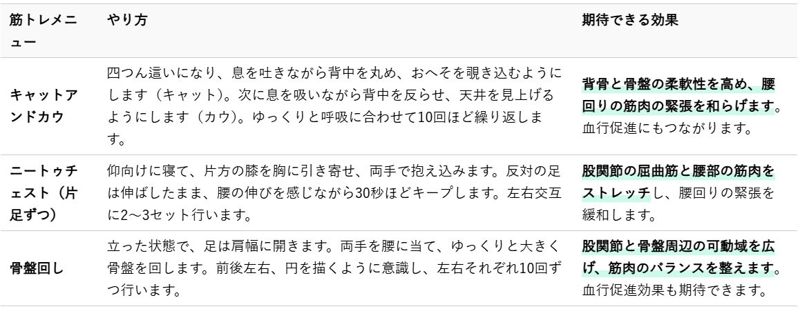 - 柔軟性の改善: 筋トレと合わせてストレッチを行うことで、硬くなった筋肉をほぐし、関節の可動域を広げ、腰への負担を減らします。