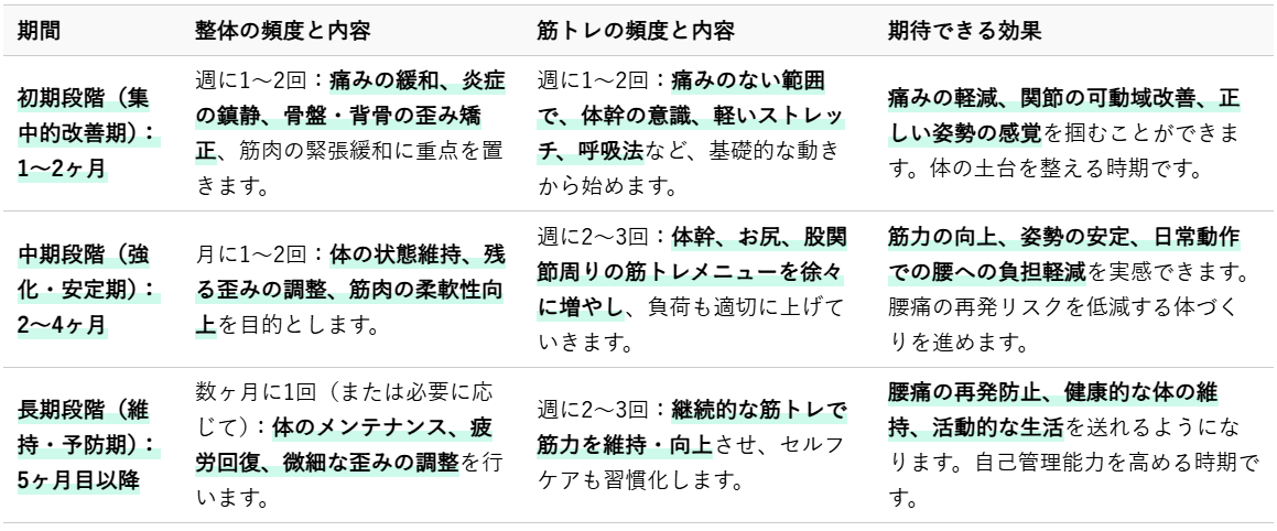 腰痛を根本から改善し、その状態を維持するためには、計画的かつ継続的なアプローチが不可欠です。ここでは、一般的な腰痛改善の段階に応じた、筋トレと整体の理想的な組み合わせプランをご紹介します。