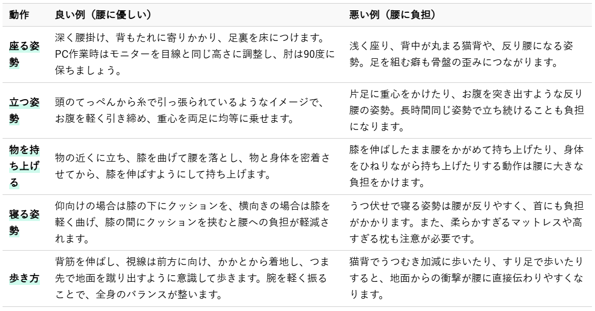 私たちの身体は、無意識のうちに特定の姿勢や動作の癖を持っています。これらの癖が腰に負担をかけ、腰痛の原因となることがあります。日々の生活の中で、腰に優しい姿勢と動作を心がけることが大切です。