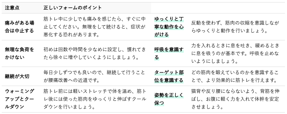 腰痛改善のための筋トレは、無理なく、正しいフォームで行うことが最も重要です。間違った方法で行うと、かえって腰に負担をかけ、症状を悪化させる可能性もあります。