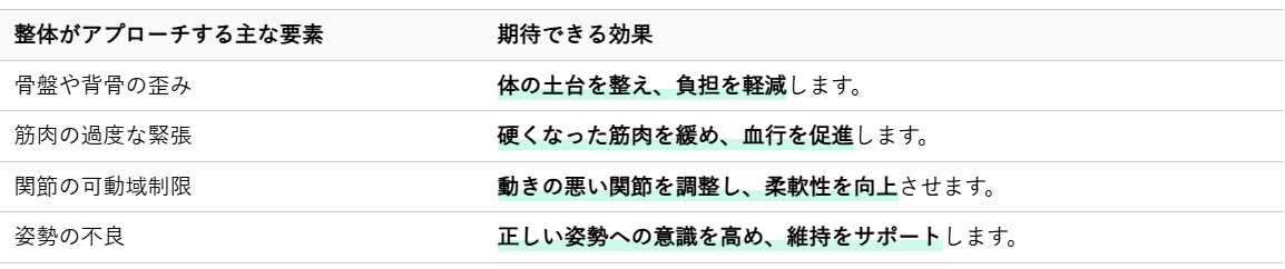 また、整体は体の歪みを整え、固まった筋肉を専門的にケアすることで、痛みを和らげ、筋トレの効果をさらに引き出す役割を担います。ご自身の状態に合わせた施術を受けることで、よりスムーズに改善への道を歩めるでしょう。