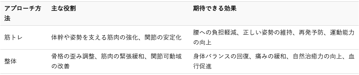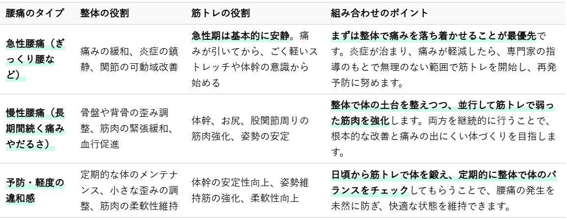 腰痛の改善において、筋トレと整体はそれぞれ異なるアプローチで効果を発揮します。しかし、この二つを単独で行うよりも、症状や目的に合わせて組み合わせることで、より高い効果と持続的な改善が期待できます。ここでは、腰痛を根本から治し、再発を防ぐための理想的な組み合わせ術について詳しく解説いたします。