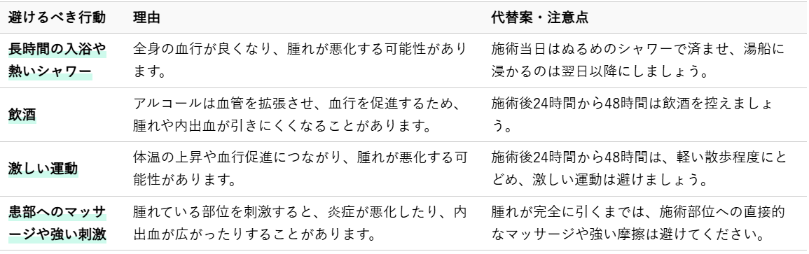 腫れや内出血がある期間は、血行を過度に促進する行為を避けることが重要です。血行が良くなると、血管が拡張し、腫れや内出血が悪化する可能性があるためです。