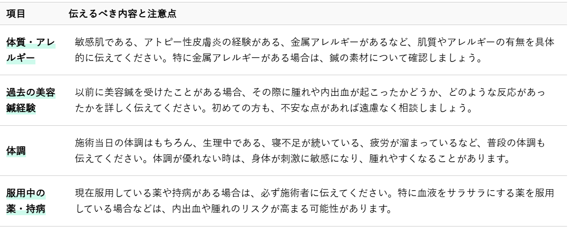 伝えるべき主な項目を以下の表にまとめました。これらの情報を事前に整理し、施術者に伝えることで、より安全で効果的な施術を受けることができます。