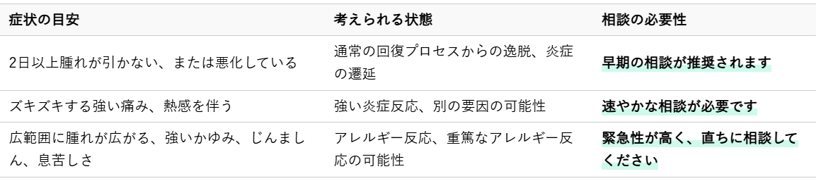 この種類の腫れは、体が正常に反応している証拠であり、一時的なものであることがほとんどです。数時間から数日で自然に引いていくことが一般的です。