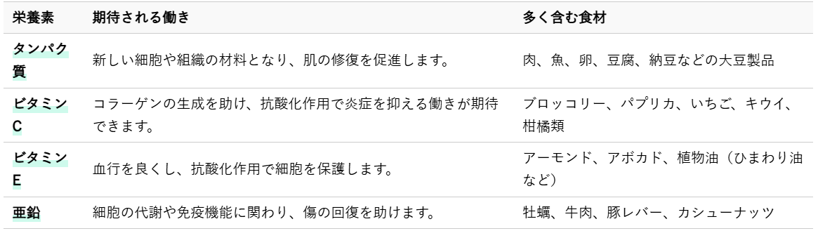 以下に、腫れの回復をサポートする主な栄養素と、それらを多く含む食材をまとめました。