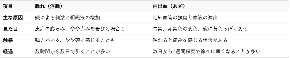 腫れは組織液の増加によるもので、内出血は毛細血管からの血液の漏れが原因で起こります。それぞれの特徴を以下の表で比較してみましょう。