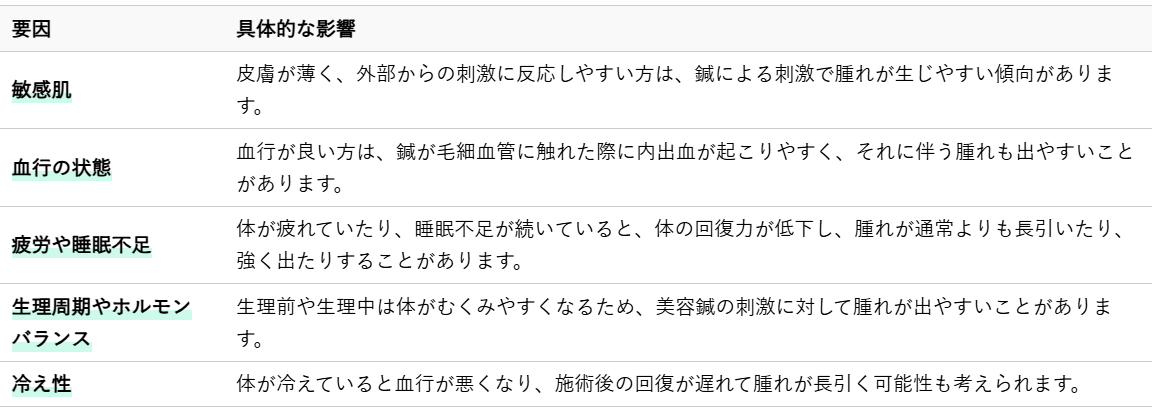 美容鍼の施術は同じでも、人によって腫れの出方や引くまでの時間に差が出ることがあります。これは、個人の体質やその日の体調が大きく影響するためです。