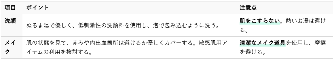 • メイク道具は清潔に: スポンジやブラシは清潔なものを使用し、肌に直接触れる際は優しく行いましょう。