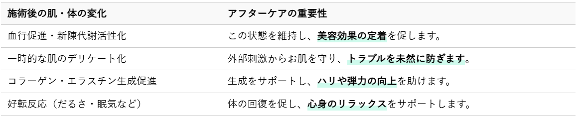 具体的な肌や体の変化と、それに対するアフターケアの重要性を以下にまとめました。