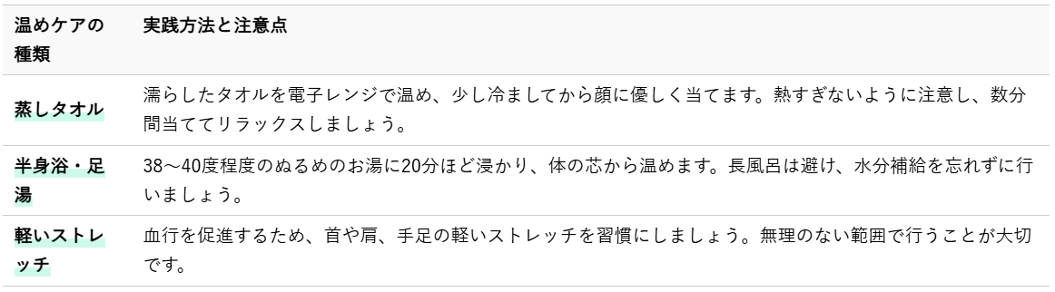 ご自宅で手軽にできる温めケアには、蒸しタオル、半身浴や足湯、軽いストレッチなどがあります。特に、施術を受けた顔周りには、温かい蒸しタオルを優しく当てることで、リラックス効果と血行促進効果が期待できます。全身を温める入浴は、湯船に浸かることで体の芯から温まり、血流を促すことができます。