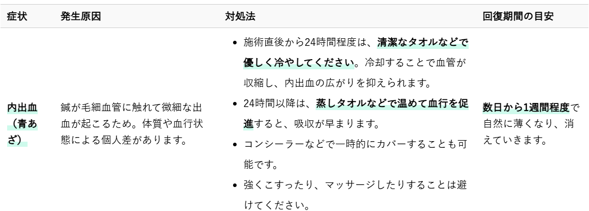 内出血や赤みが出た場合でも、適切なケアを行うことで回復を早め、安心して過ごすことができます。以下の表を参考に、落ち着いて対処してください。