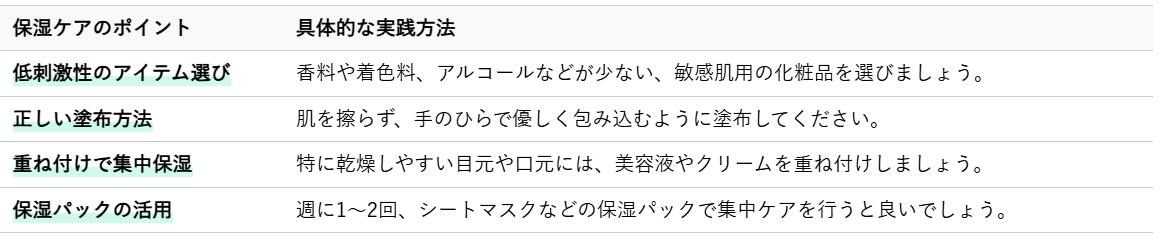 保湿ケアには、肌に優しい低刺激性のアイテムを選ぶことをおすすめします。セラミド、ヒアルロン酸、コラーゲンなどの保湿成分が配合された化粧水、美容液、乳液、クリームなどをライン使いすると良いでしょう。洗顔後はすぐに化粧水で水分を補給し、その後に美容液で栄養を与え、最後に乳液やクリームで潤いに蓋をするように心がけてください。特に乾燥が気になる部分には、重ね付けやパックを取り入れるのも効果的です。