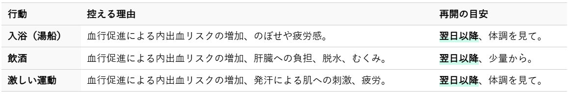 • 飲酒は翌日以降に: 体が回復するまで、当日の飲酒は控えましょう。