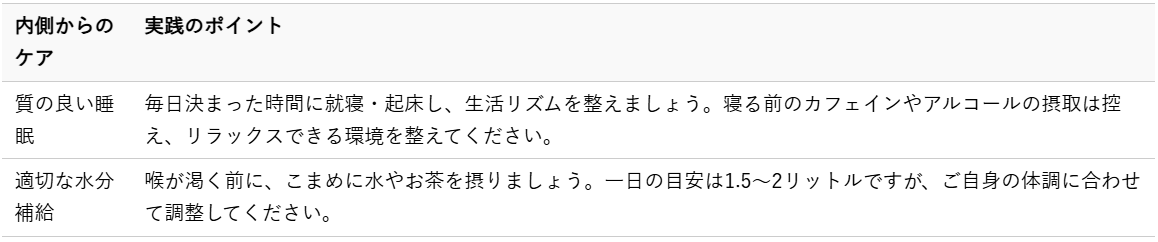 美容鍼の効果を最大限に高め、美しい肌を育むためには、内側からのケアも非常に大切です。質の良い睡眠と適切な水分補給は、肌の再生能力を高め、健康な体を維持するために欠かせない要素です。