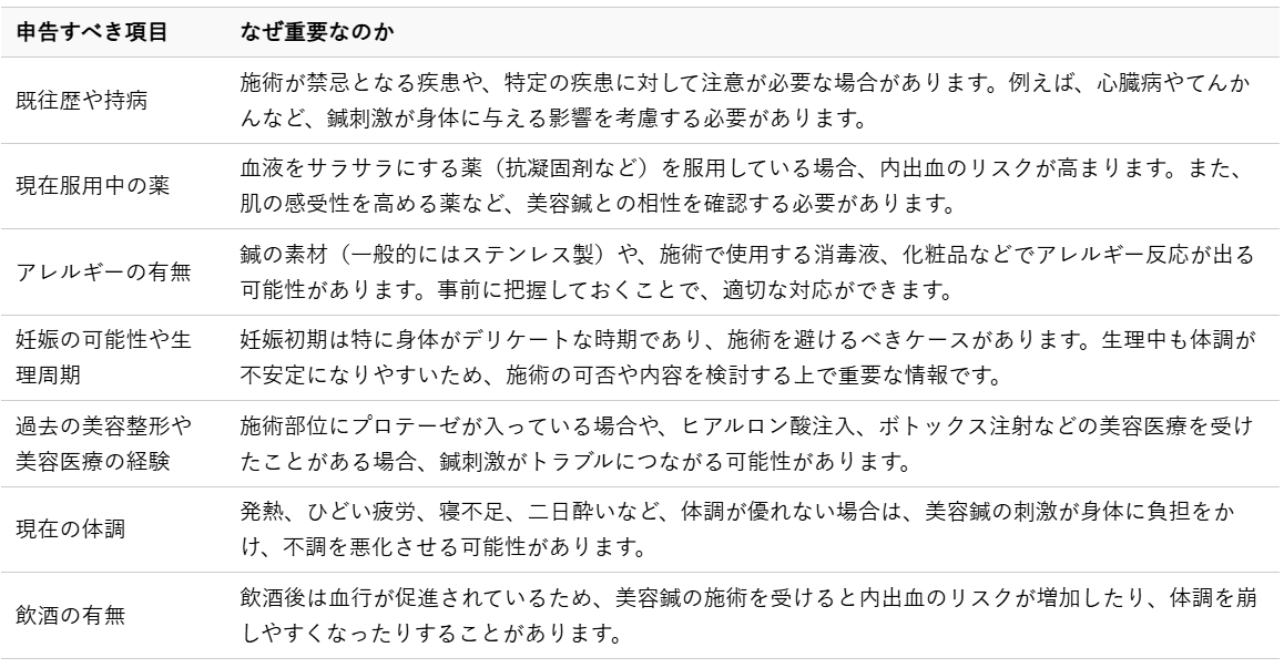 特に、以下のような項目については、些細なことだと感じても、必ず施術者にお伝えください。これらの情報が欠けていると、予期せぬトラブルや健康上の問題につながる可能性があります。