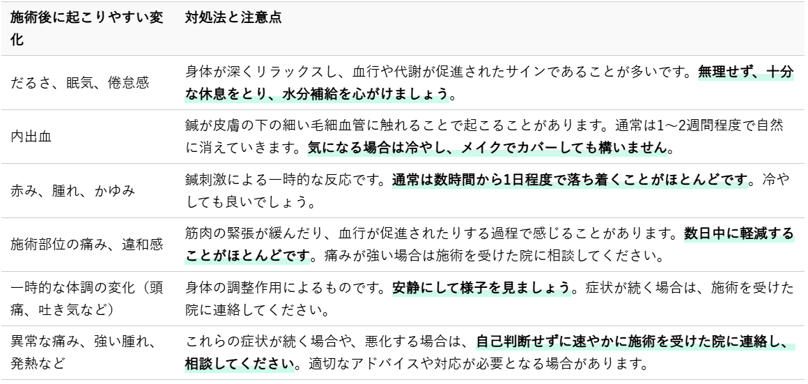 しかし、中には注意が必要な変化もありますので、ご自身の身体の声に耳を傾け、適切に対応することが大切です。施術後にどのような変化が起こり得るのか、そしてどのように対処すべきかを知っておくことで、安心して回復期間を過ごすことができます。