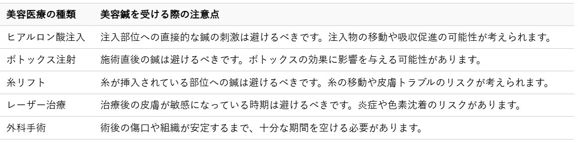 また、妊娠中の方、生理中や体調が優れない方、極度の疲労や寝不足の方、飲酒後の方、皮膚に炎症や傷がある方などは、一時的に施術を避けるべき時期です。