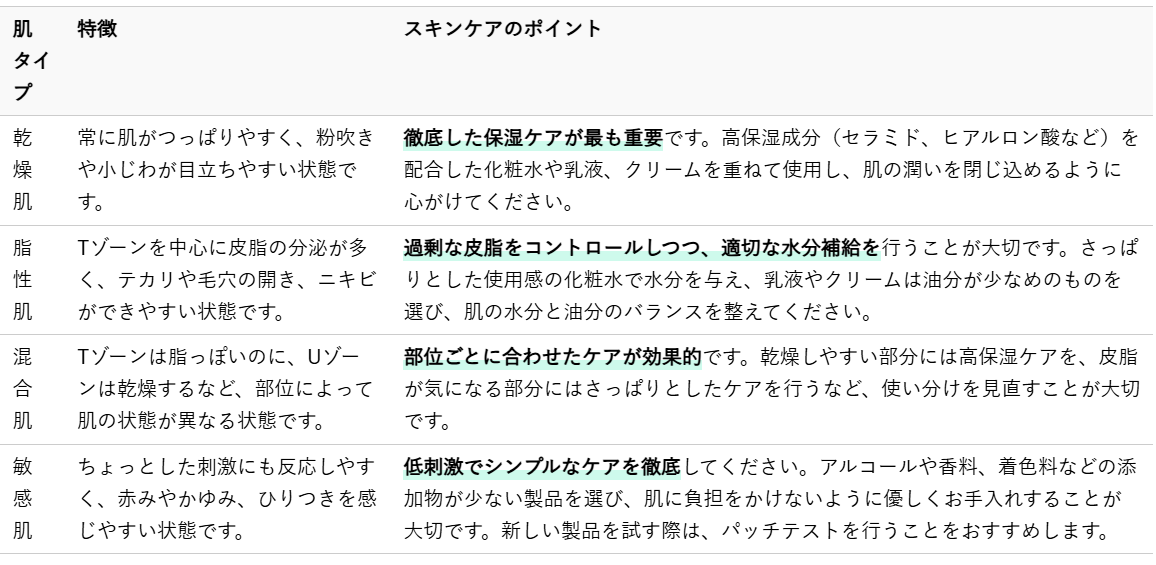 ご自身の肌タイプを正しく理解し、それに合ったスキンケアを選ぶことが美肌への第一歩です。肌タイプは、乾燥肌、脂性肌、混合肌、敏感肌の大きく4つに分けられます。それぞれの肌タイプに合わせたケアを見直すことで、肌本来の力を引き出すことができます。