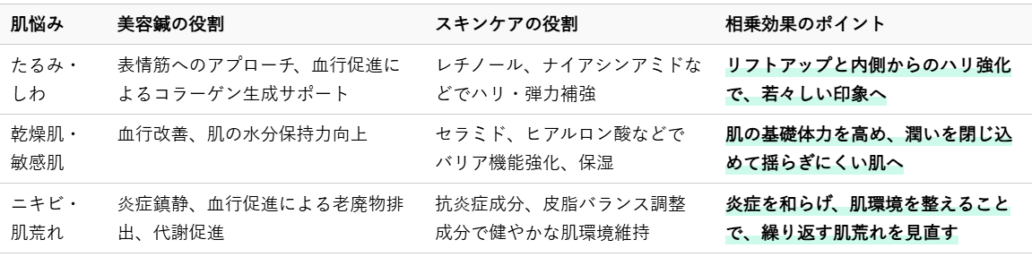 具体的な肌悩みに対して、美容鍼とスキンケアの組み合わせがどのように作用するのかを見ていきましょう。