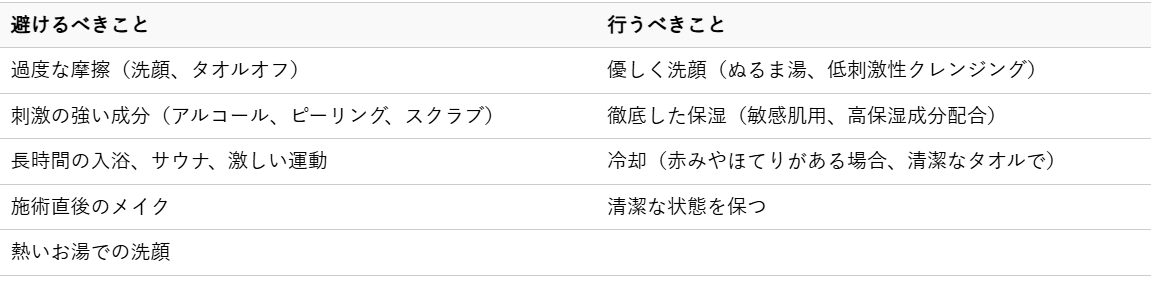 使用するスキンケア製品は、低刺激性で、肌を優しく鎮静させる成分(例えば、グリチルリチン酸ジカリウムなど)が配合されたものを選ぶと良いでしょう。香料や着色料、防腐剤などが少ない、敏感肌向けの製品がおすすめです。施術直後の肌は、普段使っている製品でも刺激を感じることがあるため、新しい製品を試すのは避け、使い慣れた優しいものを選んでください。