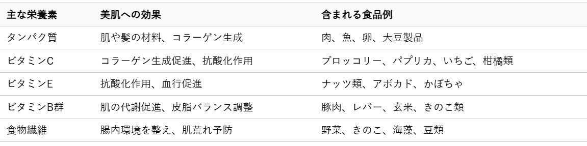 肌の材料となる栄養素をバランス良く摂取することが大切です。特に、タンパク質、ビタミン、ミネラル、食物繊維は美肌作りに欠かせません。抗酸化作用のある食品を積極的に取り入れることで、肌の老化を招く活性酸素から肌を守ることができます。