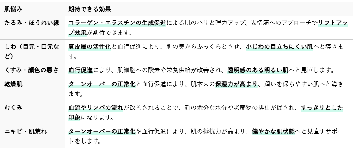 美容鍼は、幅広い肌悩みに対応できる可能性を秘めています。具体的にどのような肌悩みの改善が期待できるのかを、以下の表にまとめました。