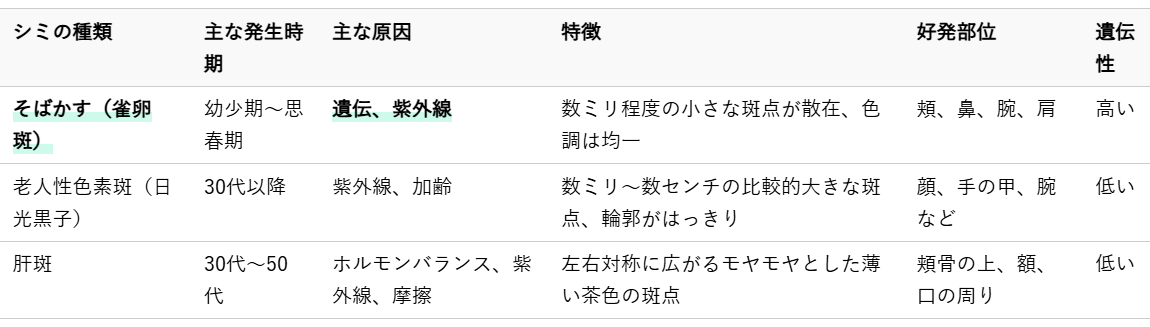 そばかすはシミの一種ですが、他の一般的なシミとは異なる特徴を持っています。ここでは、そばかすと混同されやすい代表的なシミとの違いを比較してみましょう。