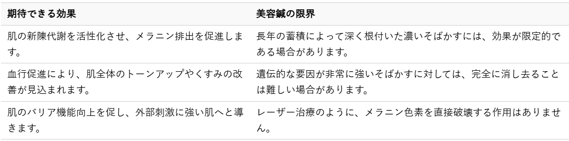 美容鍼は、肌が持つ本来の力を引き出し、そばかすを目立たなくさせることを目指すものです。施術を受ける際は、これらの効果と限界を理解した上で、現実的な目標設定をすることが重要になります。