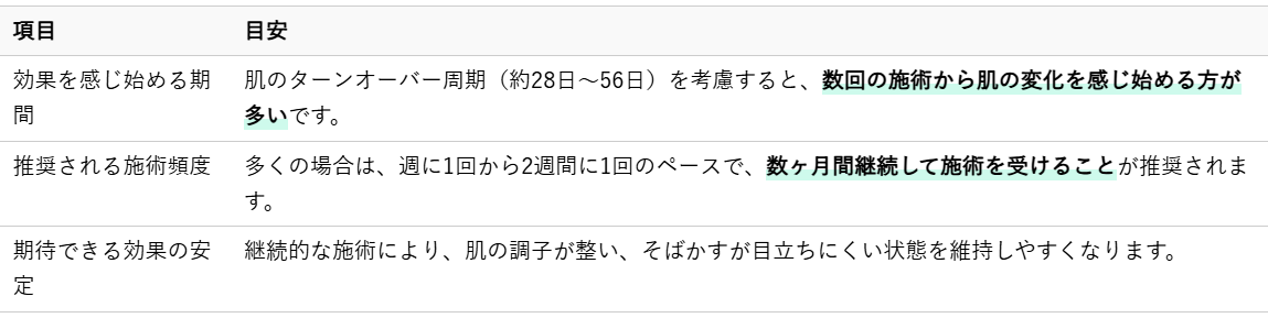 しかし、これはあくまで一般的な目安であり、一人ひとりの肌の状態に合わせて施術計画を立てることが最も重要です。専門家とのカウンセリングを通じて、ご自身の目標に合わせた最適なプランを見つけることをおすすめします。施術を始める前に、ご自身の肌の状態や目標をしっかりと伝え、納得のいく計画を立てましょう。