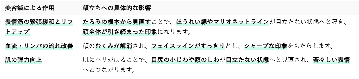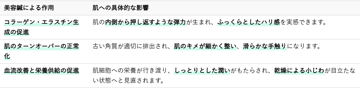 美容鍼は、肌の表面的なアプローチに留まらず、身体の内側から美しさを引き出すことで、様々な具体的な美容効果をもたらします。肌の質感や顔立ちの変化、そして全体的な印象の向上を期待できるでしょう。