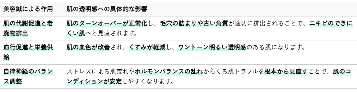 肌のトラブルは、見た目の印象だけでなく、日々の気分にも影響を与えます。美容鍼は、肌の内側から健康的な状態を促し、ニキビやくすみのない、透明感あふれる肌へと導くことが期待できます。