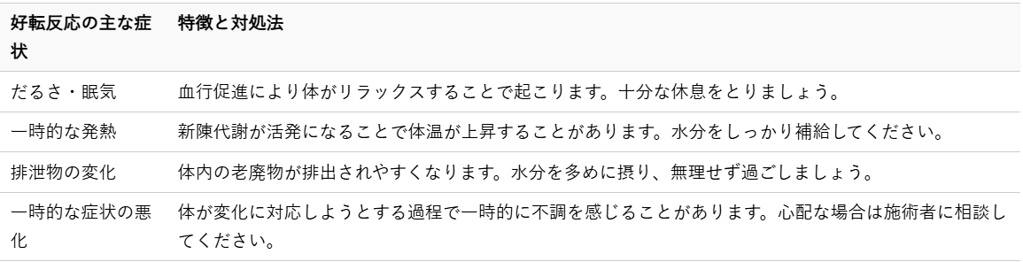 また、施術後にだるさや眠気を感じる方もいらっしゃいます。これは血行が促進され、体がリラックス状態になることで起こる反応です。一時的なもので、ゆっくり休むことで回復します。