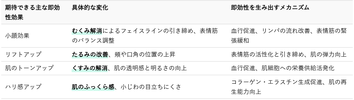 美容鍼は、施術直後からその変化を感じやすい点が大きな魅力の一つです。ここでは、特に即効性を実感しやすい具体的な効果について詳しくご紹介いたします。