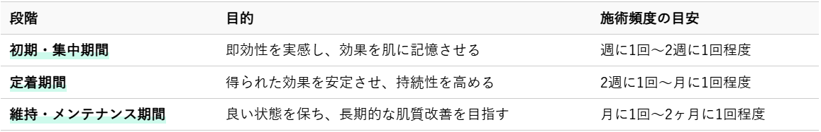 施術頻度は、お悩みの内容、肌の状態、体質、そして目標とする効果によって一人ひとり異なります。一般的には、効果を早く実感し、定着させたい初期段階では、比較的短い間隔で施術を受けることをおすすめします。その後、効果が安定してきたら、徐々に施術間隔を空けて、維持していくサイクルへと移行します。